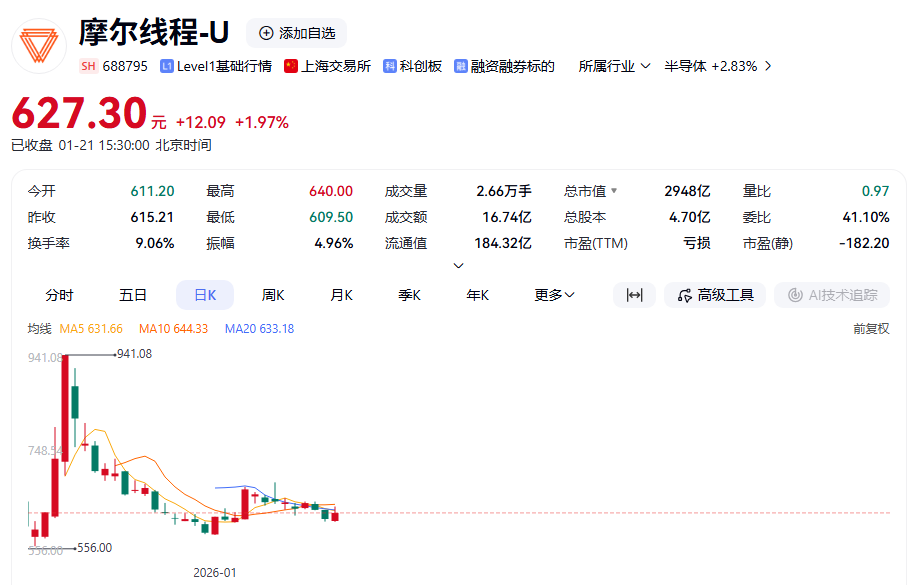 摩尔线程于2025年12月5日登陆科创板。当天,摩尔线程开盘大涨468.78%,上市首日股价即突破600元/股,收盘大涨425.46%。上市第二日股价微跌,接下来几个交易日股价大幅攀升,到上市第五日股价最高报941.08元/股,随后股价震荡回落,截至2026年1月21日收盘,摩尔线程最新股价报627.3元/股,总市值接近3000亿元。